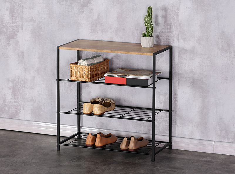 ◎Black Metal Shoe Rack with Wooden Top Plate