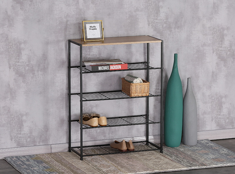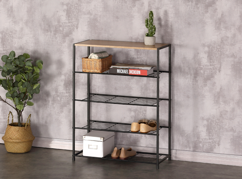 ◎Black Metal Shoe Rack with Wooden Top Plate